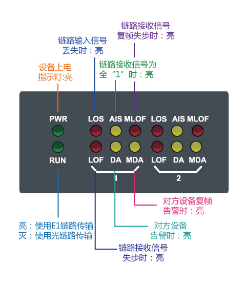 指示燈-MOLF:鏈路接收信號復(fù)幀失步時:亮(紅)